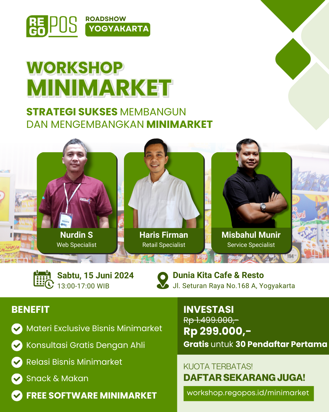 REGOPOS Roadshow hadir untuk membagikan pengalaman tentang strategi meraih kesuksesan dalam membangun dan mengembangkan bisnis ritel khususunya minimarket dan pengelolaan distribusi dengan memanfaatkan platform digital. Mari bergabung bersama kami dan miliki minimarket dengan omset jutaan per harinya!